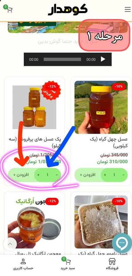 طبق تصویر شماره یک، شما محصولات رو می بیند و زیر هر محصول می تونید با زدن مثبت یا منفی تعداد محصول رو افزایش یا کاهش بدین. و با زدن افزودن اون محصول رو انتخاب کنید.