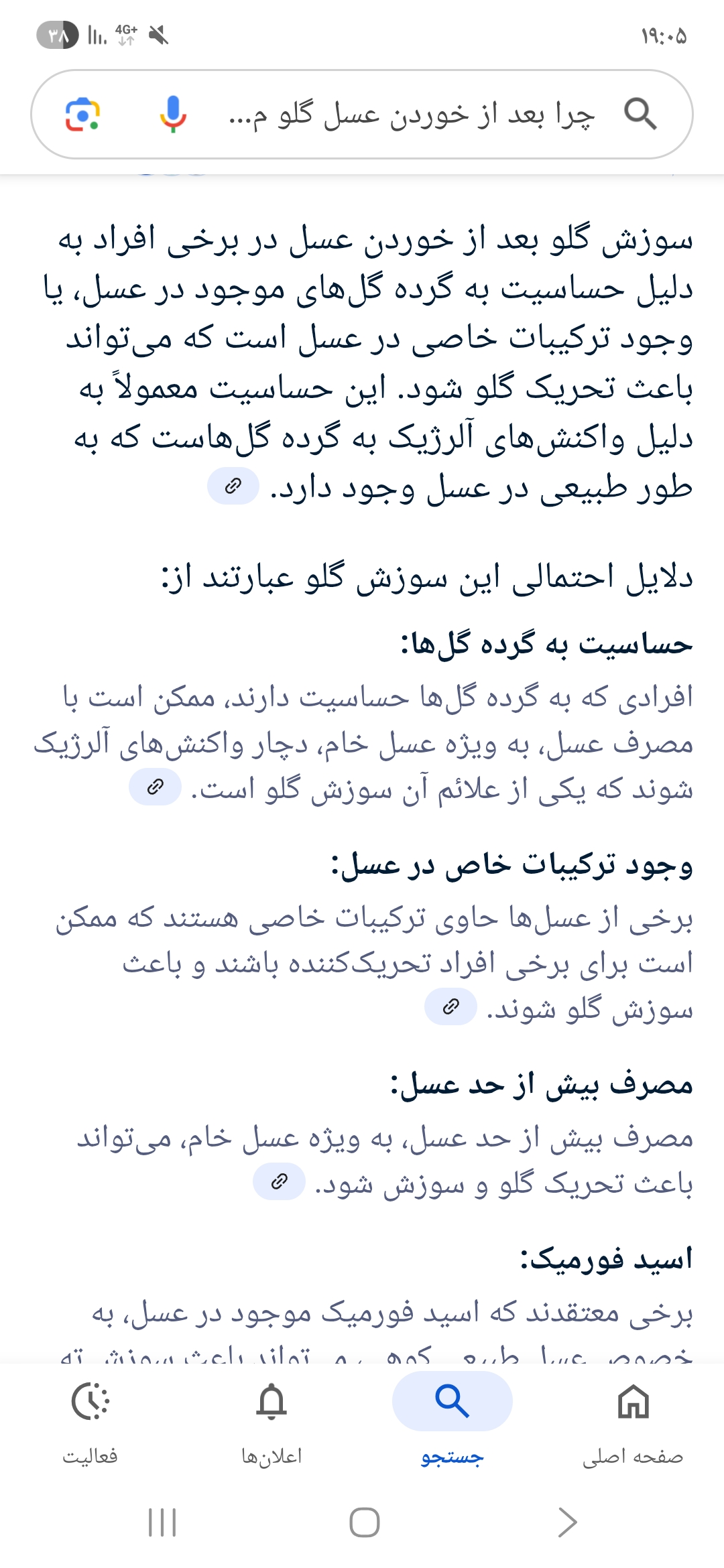 سلام ایتا ازتون در مورد سوزش گلو بعد از عسل پرسیدم ولی ندیده بودید خودم تو گوگل سرچ کردم پیدا کردم شاید سوال کسی دیگه هم باشه